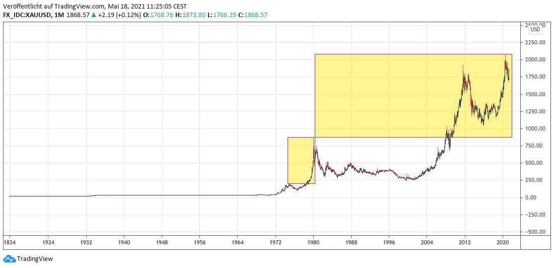Im Dezember 1974 erreichte der Goldpreis ein erstes Zwischenhoch bei 195,50 Dollar, welches er im Juli 1978 überwand. In der Folge stieg der Goldpreis bis zum Zyklushoch im Januar 1980 bis auf 873 Dollar, also um 346,6 %.