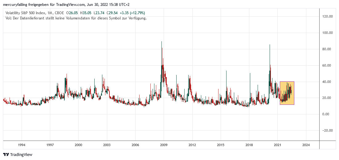 Ein Rückblick auf das Verhalten des VIX seit dem Allzeithoch des S&P 500 zu Jahresbeginn zeigt nun, dass sich die vermutete Beharrungstendenz auf immer höheren Niveau weiter verstärkt hat. Denn die als Candle-Stick-Chart dargestellten Monatscandles verdichten den Aufenthaltsraum der VIX-Werte und zeigen dabei, dass wir aktuell die stärkste Ballung von VIX Werten deutlich oberhalb des historischen Durchschnittes seit dem Beginn der 1990er-Jahre haben!