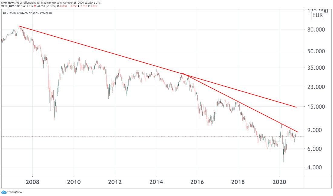 Aktuell weht ein Hauch von Optimismus durch die europäische Bankenlandschaft. Erst vor wenigen Tagen konnten bedeutende Institute wie die Barclays, die HSBC und Santander ein solides Zahlenwerk für das dritte Quartal vorlegen. In dem jüngst wieder etwas positiveren Branchenumfeld gelang der Deutschen Bank ebenfalls eine positive Überraschung. So profitierte die Großbank im dritten Quartal vor allem von einem positiven Geschäft mit Anleihen, da viele Unternehmen das niedrige Zinsumfeld nutzten, um sich frische Liquidität im Corona-bedingt wirtschaftlich sehr unsicheren Umfeld zu besorgen. Entsprechend stiegen die Erträge im Investmentbanking gegenüber der Vorjahresperiode von 1,66 Mrd. Euro auf 2,37 Mrd. Euro an.