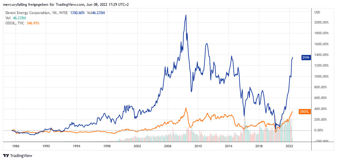 Noch eindrücklicher und wegen seines längeren Zeitraums relevanter ist ein Blick auf den Kursverlauf der Devon Energy – Aktie und des Ölpreises.
