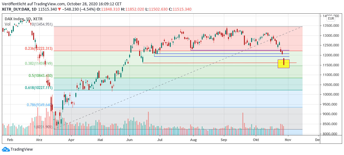 Der DAX hat den heutigen Handel mit einem neuen Kurs-Gap eröffnet und fällt auch im Tagesverlauf weiter. Aktuell liegt er 548 Punkte bzw. 4,54 % tiefer bei 11.515 Punkten.