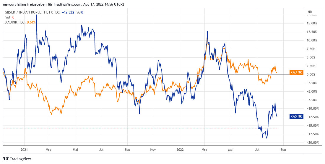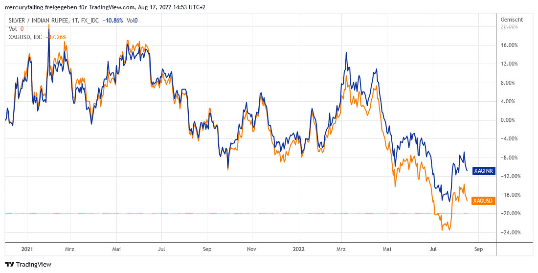 So zeigte Silber in indischen Rupien über weite Strecken des Jahres 2021 eine stärkere Entwicklung als Gold. Dies drehte sich aber mit dem Einmarsch Russlands in die Ukraine um. Und seither hat sich Silber deutlich schwächer als Gold.