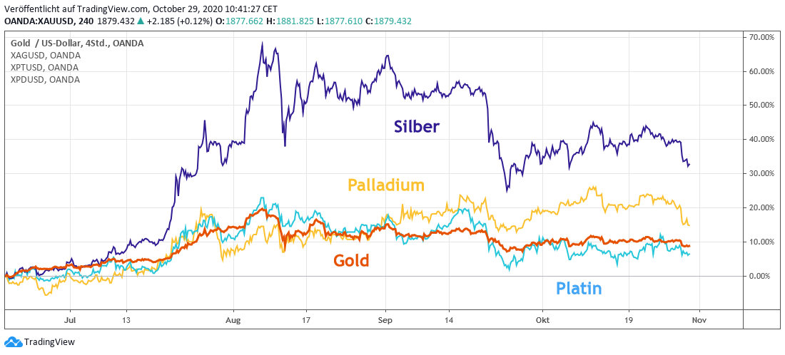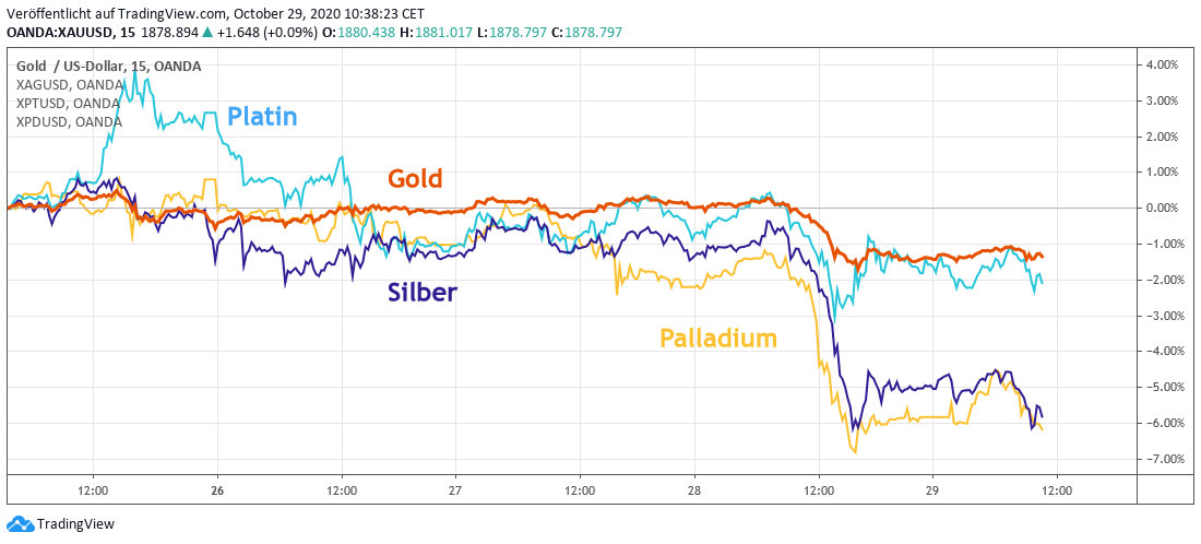 Ein Blick auf die kurzfristige relative Entwicklung der Edelmetalle zeigt jedoch, dass es signifikante kurzfristige Unterschiede zwischen Gold, Silber, Platin und Palladium in der Abwärtsbewegung gab.