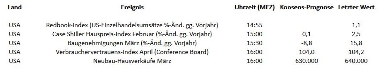Bei den US-Wirtschaftsbereichen, denen die heute Nachmittag zur Publikation anstehenden Konjunkturdaten zuzuordnen sind, handelt es sich um den Einzelhandel (Redbook-Index), das Bauwesen (Haupreise, Baugenehmigungen sowie Neubauverkäufe) sowie die aktuelle Lage des Verbrauchervertrauens in den USA (Index des Conference Board).