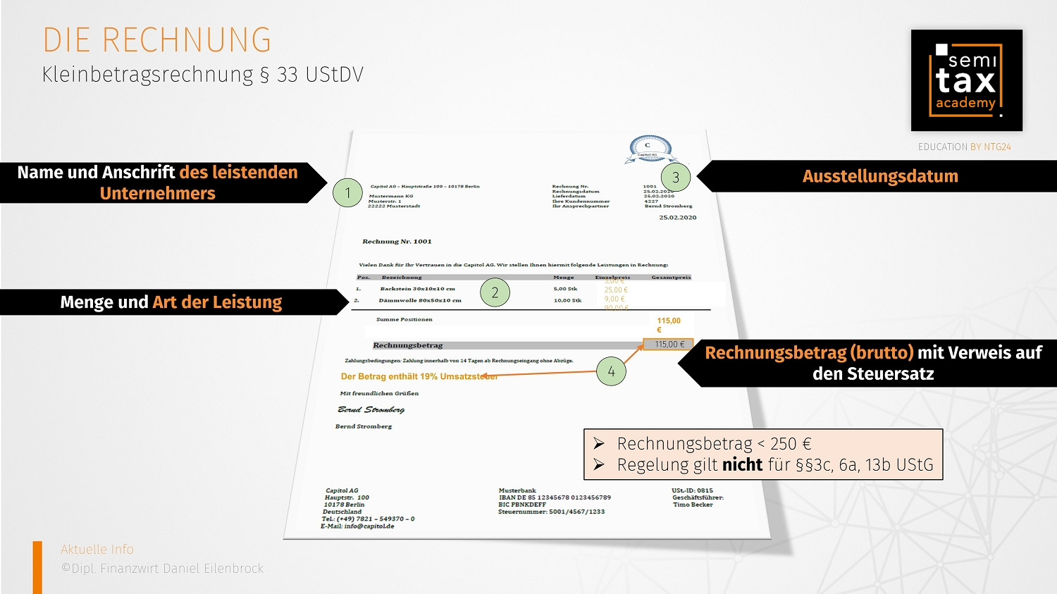 Unter Rechnung versteht man ein Dokument, mit welchem ein Unternehmer seinen Kunden aufgrund eines Kauf- oder eines Leistungsvertrages (Dienstleistung, Honorarleistung o.ä.) über das fällige Entgelt informiert. Das Layout kann nach persönlichen Vorlieben gestaltet werden, jedoch muss es inhaltlich bestimmte Merkmale enthalten. Diese Mindestbestandteile sind abschließend im §14 Abs. 4 des Umsatzsteuergesetzes (UStG) aufgeführt. Alle Tatbestandsmerkmale können Sie dem folgenden Schaubild inkl. Musterrechnung entnehmen:
