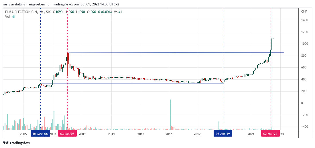 Die Aktie von Elma Electronics hat sich nach einer fast 15-jährigen Bodenbildung seit Mitte 2021 wieder auf den Weg nach oben gemacht. Der Korrekturboden im Januar 2019 fiel dabei mit 330 CHF genau auf die Unterstützung des Monatsultimos vom März 2006. Inzwischen konnte das vom Januar 2008 stammende Allzeithoch bei 850 CHF im Mai 2022 überwunden werden. Das freiwerdende Momentum schob den Titel bis auf das aktuelle Allzeithoch von 1.090 CHF.