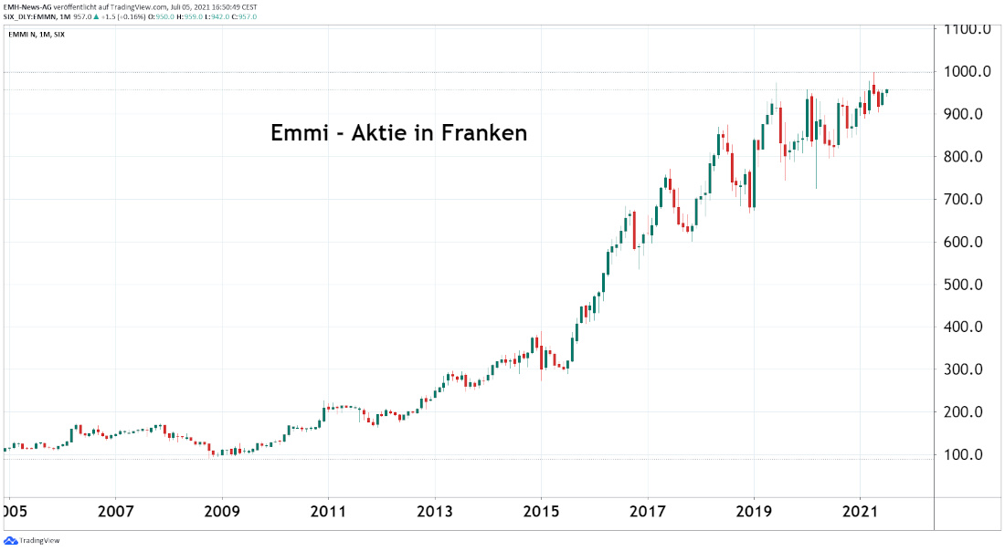 So befindet sich das Unternehmen seit vielen Jahren nicht nur geschäftlich in einem nachhaltigen Aufwärtstrend, vielmehr konnten Anleger auch mit der Emmi-Aktie auf Dauer eine prächtige Rendite einfahren. Wurde der Anteilschein Anfang 2009 zeitweise unter der Marke von 100 Franken gehandelt, so mussten im April 2021 bis zu 997.50 Franken für den Titel bezahlt werden. Da die Geschäfte im ersten Quartal weiterhin gut liefen, dürfte es unserer Meinung nach daher nur eine Frage der Zeit sein, bis das Papier in den vierstelligen Kursbereich vordringt.