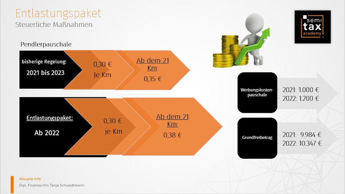 Die Koalition hat im Entlastungspaket steuerliche Maßnahmen beschlossen, die insbesondere Steuerpflichtige entlasten soll, die von den stark steigenden Spritpreisen betroffen sind, durch die Erhöhung der Pendlerpauschale. Durch die Erhöhung der Werbungskostenpauschale und des Grundfreibetrags werden die Preissteigerung für alle Steuerbürger abgemildert.