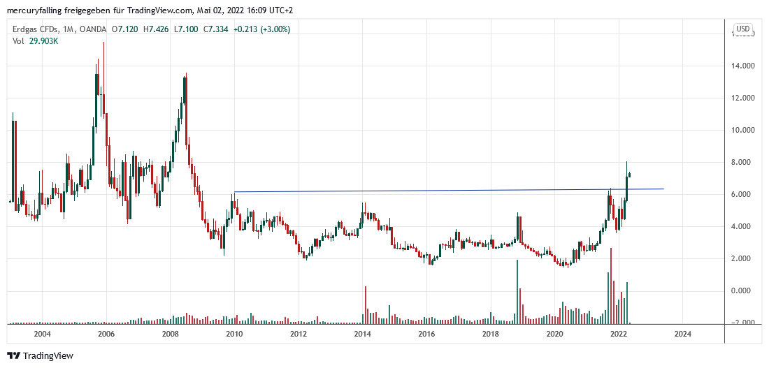 Allerdings hat Erdgas mit dem Ausbruch ein bedeutendes mittelfristiges Kaufsignal generiert. Ein Blick auf den langfristigen Kursverlauf zeigt zwar eine massive Widerstandszone im Bereich unterhalb von 8,05 Dollar. Der Einfluss des Ausbruchs nach einer mehr als 13 Jahre andauernden Bodenbildung dürfte aber schon bald wieder überwiegen.