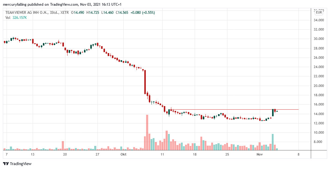 Die Aktie von Teamviewer wurde Anfang Oktober nach einer Prognosesenkung durch das Unternehmen deutlich abgestraft und hat sich seither praktisch halbiert. Nach den am 03.11.2021 mitgeteilten Konkretisierungen zum Geschäftsgang im 3. Quartal und einer Bestätigung der gesenkten Gesamtjahresprognose kann sich der Titel nun aber erstmals seit 4 Wochen deutlich von den herben Verlusten erholen.