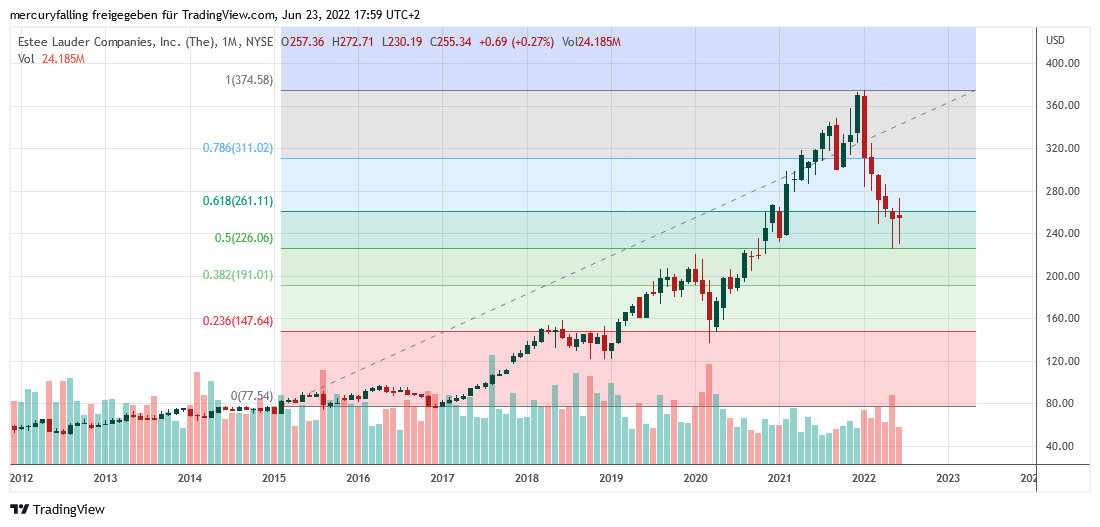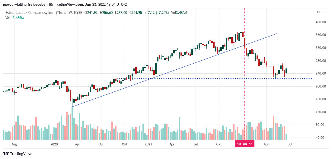 Vor diesem Hintergrund hat die Aktie von Estee Lauder jüngst aussichtsreiche Versuche gestartet, auf dem Niveau oberhalb von rund 224 US-Dollar einen Boden zu bilden. Dabei lief der charttechnische Rückzug ab dem 14.01.2022 nach dem Bruch des seit dem Corona-Crash im März 2020 laufenden Aufwärtstrends geordnet ab. Wirklicher Verkaufsdruck lässt sich zudem aus den Umsätzen nicht ableiten.