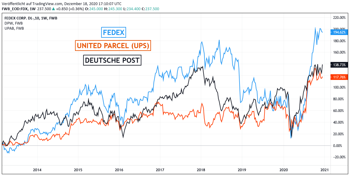 Chart: FEDEX / UNITED PARCEL / DEUTSCHE POST (jeweils in Euro)