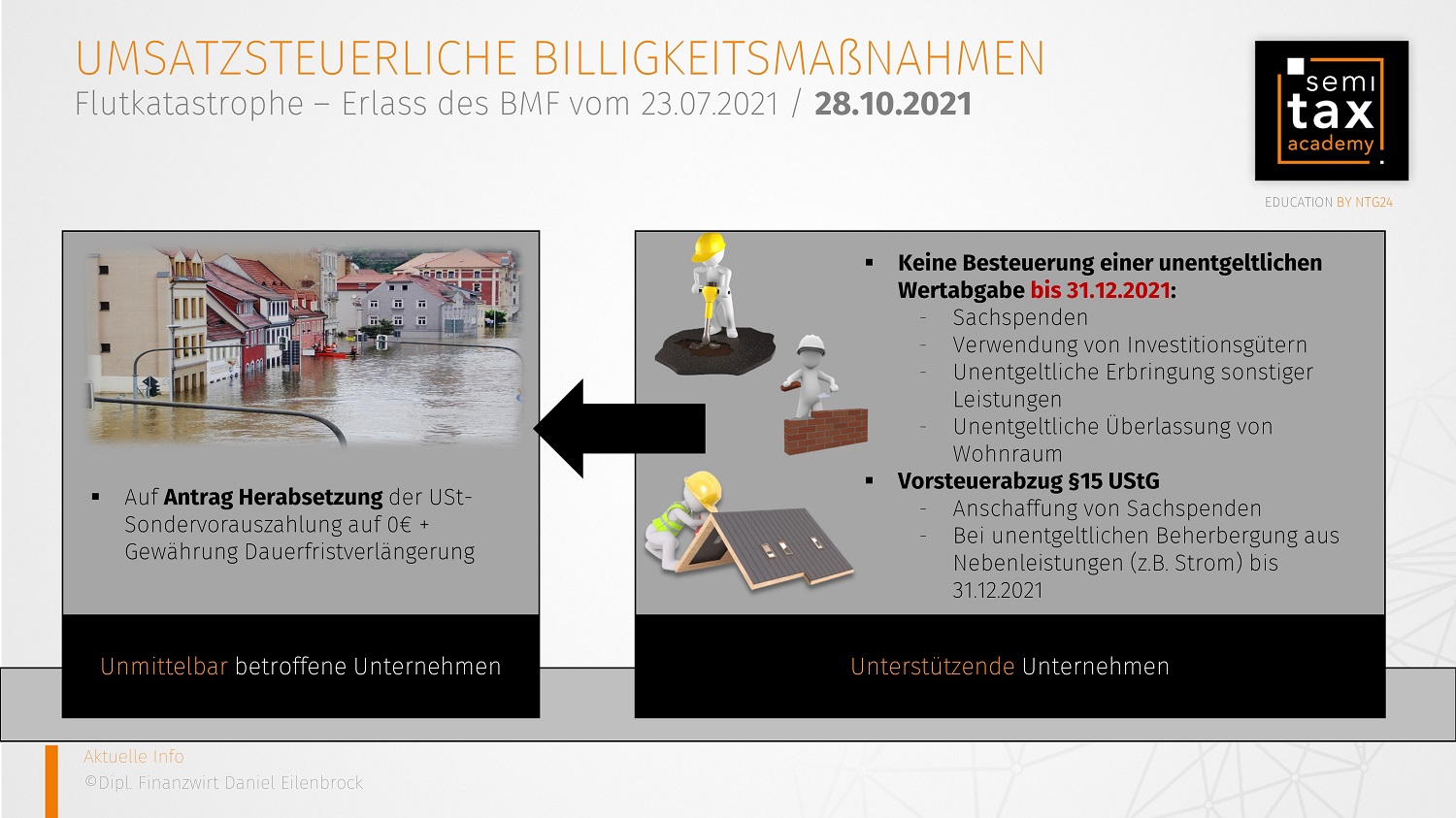 Unternehmen, die unmittelbar von der Flutkatastrophe betroffen sind und unterstützende Unternehmen sollen durch umsatzsteuerliche Rechtsfolgen nicht zusätzlich belastet werden. Das BMF hat im Wege der Billigkeitsmaßnahme bestimmte umsatzsteuerliche Grundsätze temporär außer Kraft gesetzt. Mit BMF-Schreiben vom 28.10.2021 wurden einige Billigkeitsmaßnahmen verlängert.