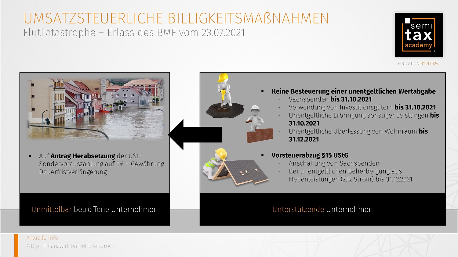 Die Finanzverwaltung hat durch den Erlass vom 23.07.2021 umsatzsteuerliche Regelungen durch Billigkeitsmaßnahmen außer Kraft gesetzt. Die Billigkeitsmaßnahmen sollen dafür sorgen, dass unmittelbar betroffene Unternehmen, sowie unterstützende Unternehmen nicht durch umsatzsteuerliche Konsequenzen belastet sind. Insbesondere unterstützende Unternehmen sollen nicht durch die Besteuerung von unentgeltlichen Wertabgaben oder die Versagung des Vorsteuerabzugs an der Unterstützung gehindert werden.
