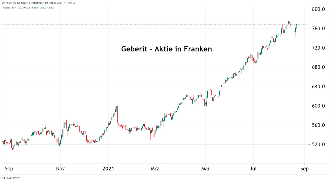Die Aktie des Sanitärtechnikkonzerns Geberit (CH0030170408) konnte Ende vergangener Woche nicht von überaus guten Quartalszahlen profitieren. So setzten nach Vorstellung der Q2-Bilanz zeitweise deutliche Abverkäufe ein, was aber auch an Gewinnmitnahmen lag, da sich der Anteilschein zuvor seit März 2020 in der Spitze deutlich mehr als verdoppeln konnte.