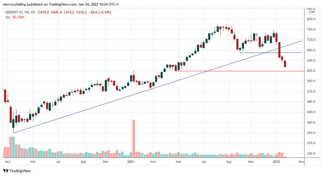 Die Aktie von Geberit reagierte gleichwohl mit Abgaben auf die ersten Geschäftszahlen. Einige Marktteilnehmer verwiesen bei dem rapportierten hohen Umsatzwachstum auf Vorzieheffekte vor den Preisanhebungen. Nähere Aufschlüsse könnte dazu die Vorlage der endgültigen Zahlen für das Geschäftsjahr 2021 am 09.03.2022 geben. Die aktuelle Korrektur des Gesamtmarktes lies auch die Aktie von Geberit weiter konsolidieren. Dabei unterschritt sie am 13.01.2022 ihren seit dem Corona-Crashtief im März 2020 laufenden mittelfristigen Aufwärtstrend.