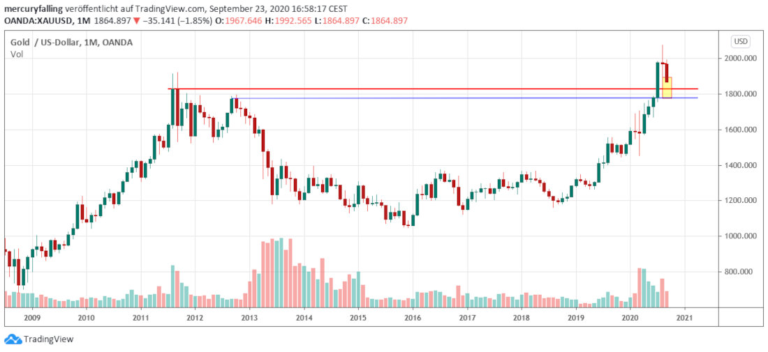 Die rote und blaue horizontale Linie signalisieren die nächsten Unterstützungen für den Goldpreis auf Monatscandle-Basis. Die rote Horizontale bildet den Monatsschlusskurs vom August 2011 bei 1.925,61 Dollar ab. Diese fungiert in der aktuellen Korrektur als erste Unterstützung. Darunter liegt eine zweite, welche sich im September 2012 bildete und welche bei 1.772,26 Dollar liegt.
