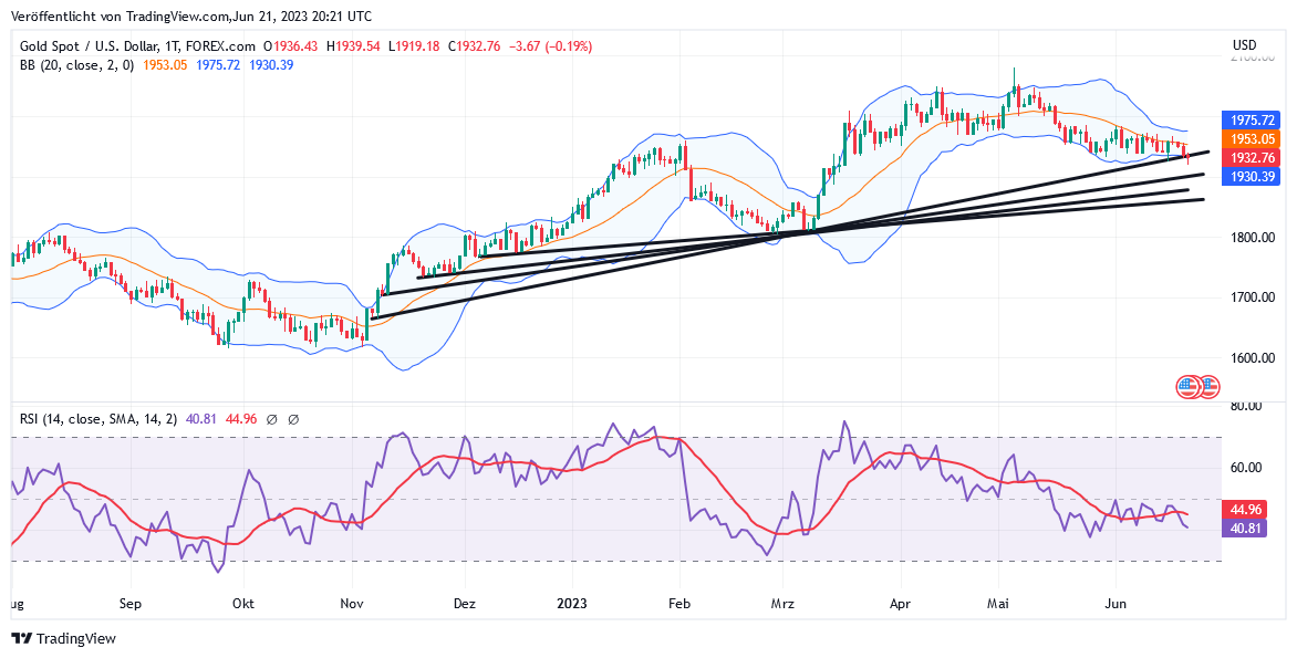Denn wenn auch der Markt auf die seit 14.06. nun schon fast „altbekannten“ Aussagen von Powell, die „weite Mehrheit“ der Zinsausschuss-Mitglieder sehe zumindest 2 weitere Zinserhöhungen zu insgesamt + 0,5 % in 2023 als erforderlich sowie Leitzinssenkungen in 2024 als ausreichend an, seit Anhörungsbeginn um 16 Uhr kaum mehr bzw. sogar tendenziell positiv reagierte, so ist aus unserer Sicht nun trotzdem der charttechnischen Tatsache unbedingt Rechnung zu tragen, dass nahezu mit einem „Panik-Verkauf“ von Gold bis unmittelbar vor der Anhörung und der dadurch ausgelösten Erreichung eines Tagestiefs von nur noch 1919 USD selbst der signifikant flachere Aufwärtstrend seit dem 06.11. nun nachhaltig verletzt wurde.