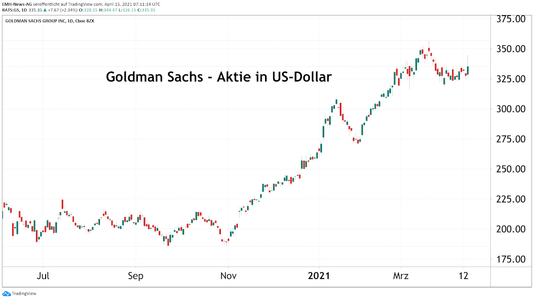 An der Wall Street reagierte die Goldman-Aktie in einer ersten Reaktion mit einem spürbaren Kursgewinn und ging schließlich gestern mit einem Plus von 2,3 % aus dem Handel. Damit setzte der Titel den seit Ende Oktober 2020 anhaltenden Aufwärtstrend fort, wobei gestern das Handelsvolumen mit insgesamt 9,87 Millionen Aktien rund dreimal so hoch wie an normalen Tagen war.