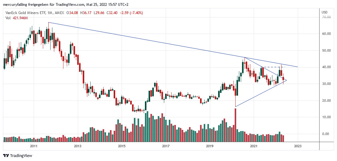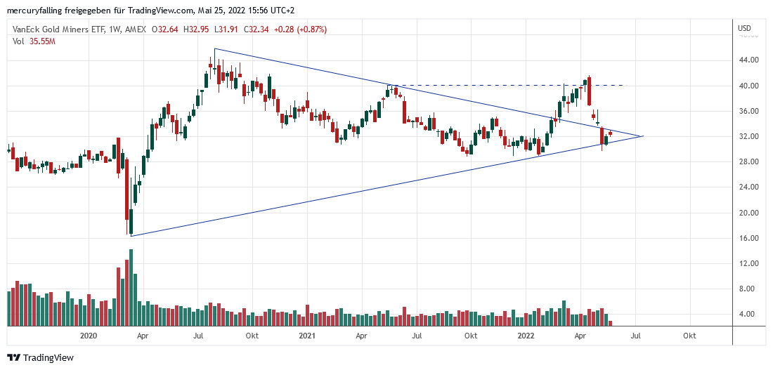 Dieser bietet derzeit für beide Sichtweisen charttechnisches Futter. Jene, die weiter Druck auf Edelmetalle und Edelmetall-Minenaktien erwarten, verweisen auf den Fehlausbruch aus dem Konsolidierungsdreieck, welches der GDX seit dem Corona-Crash im März 2020 gebildet hat. Zu allem Überfluß hatte er sein Zwischenhoch vom Mai 2021 bereits auf Wochencandle-Basis Mitte April 2022 überschritten, als er zu einer scharfen Korrektur ansetzte, die ihn sogar wieder unter seine untere Begrenzung des Konsolidierungskeils drückte.