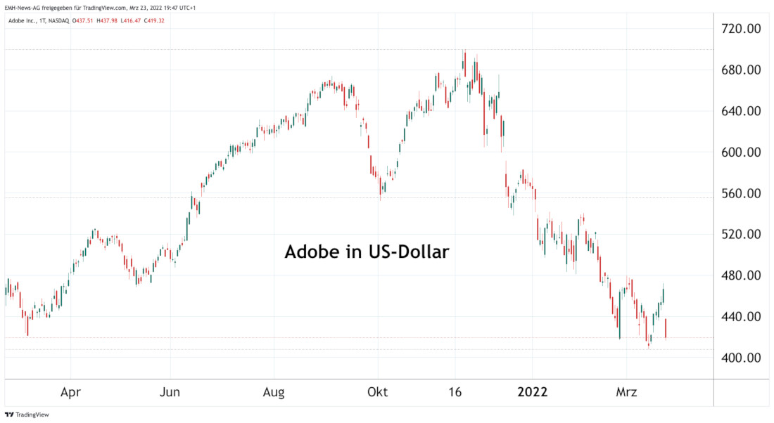 Schon im nachbörslichen Handel sackte die Adobe-Aktie nach dieser doppelten Enttäuschung durch. Im heutigen regulären Handel liegen die Notierungen zweistellig im Minus. Eine Bewegung, die noch von einem Handelsvolumen unterstrichen wird, das nahe den Rekordwerten liegt. Nicht einmal im Februar / März 2020 verzeichnete Adobe so starkes Handelsvolumen an Tagen mit fallenden Kursen.
