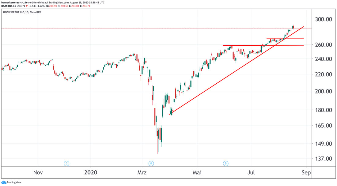 Fazit: Die Aktie von Home Depot hat seit dem Corona-Crash eine geradezu fantastische Entwicklung genommen. Auch wenn es nach den Zahlen kleinere Gewinnmitnahmen bislang gab, sollte sich der Wert in den erreichten Spitzenregionen halten können. Schön wäre es, wenn es einen kleinen Rücksetzer in den Bereich von 258/268 Dollar geben würde. Denn das wäre aus meiner Sicht dann ein interessantes Niveau für mögliche Nach- oder neue Käufe. Vorerst geht weiter abwarten bzw. halten.