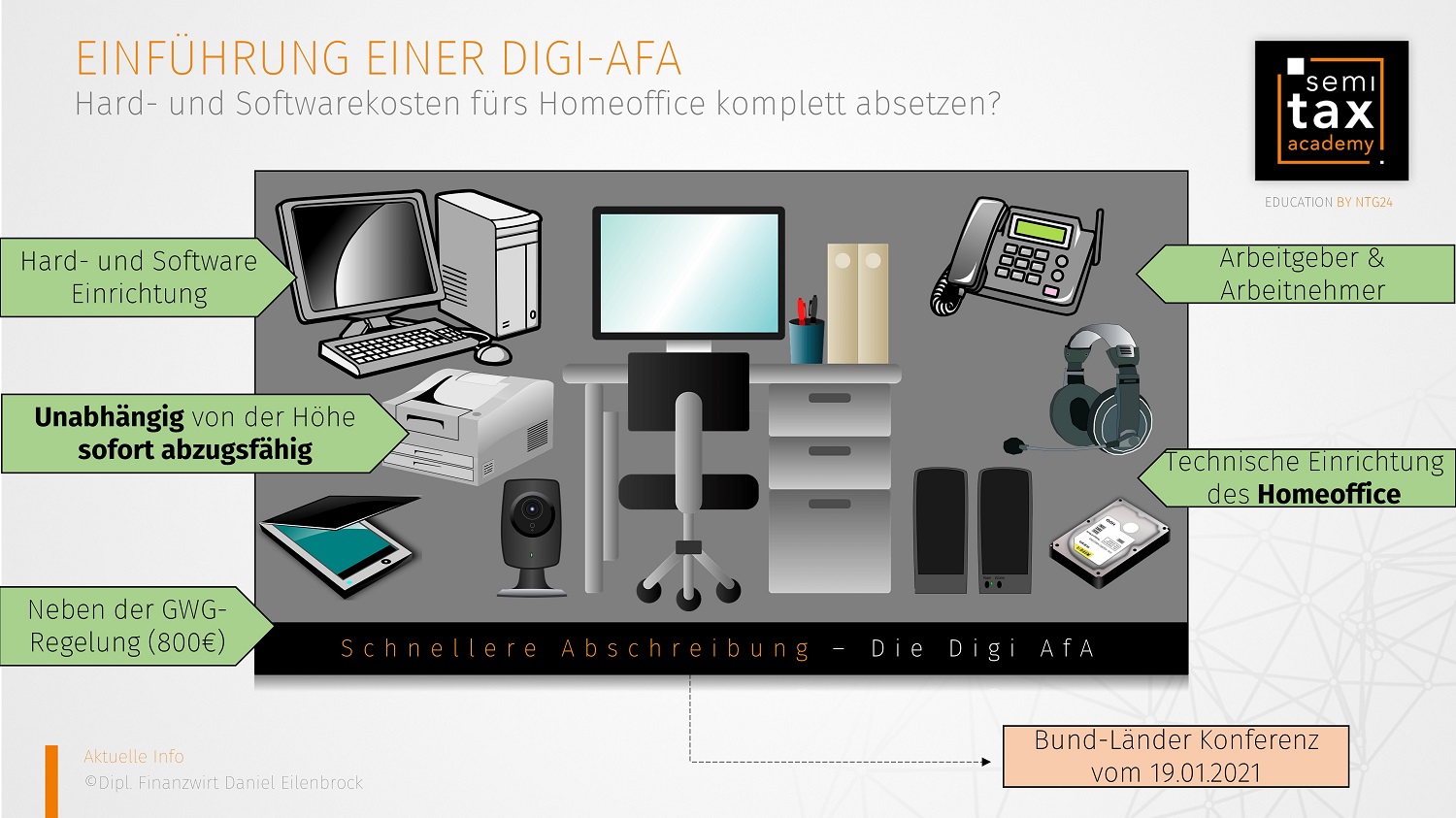 Bislang ist es ja lediglich möglich, Wirtschaftsgüter wie Laptop und Co. (wie alle anderen Arbeitsmittel), welche mit den Anschaffungskosten unter 800€ netto liegen sofort von den Steuern abzusetzen. Darüber hinaus mussten die Anschaffungskosten über die Nutzungsdauer abgeschrieben und auf Jahre verteilt werden. Künftig sollen alle Kosten für die digitale Infrastruktur sofort komplett berücksichtigt werden können.