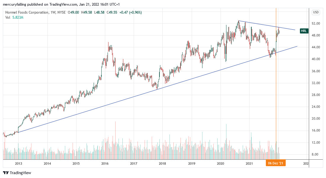 In der seit Anfang 2020 laufenden Corona-Pandemie hat die Nachfrage nach haltbaren Lebensmitteln (Fertig- und Dosengerichten) wie jenen von Hormel Foods stark zugenommen. Entsprechend erfreulich liest sich auch der letzte Quartalsbericht vom 09.12.2021 des Ende Oktober 2021 beendeten 4. Quartals. Hinzu kommt eine investorenfreundliche Dividendenpolitik, denn das Unternehmen hat seit dem Börsengang im Jahre 1928 eine Dividende ausgeschüttet und diese seit 56 Jahren ständig erhöht. Für das 4. Quartal 2021 wurde diese um 6 % auf 0,26 US-Dollar angehoben.