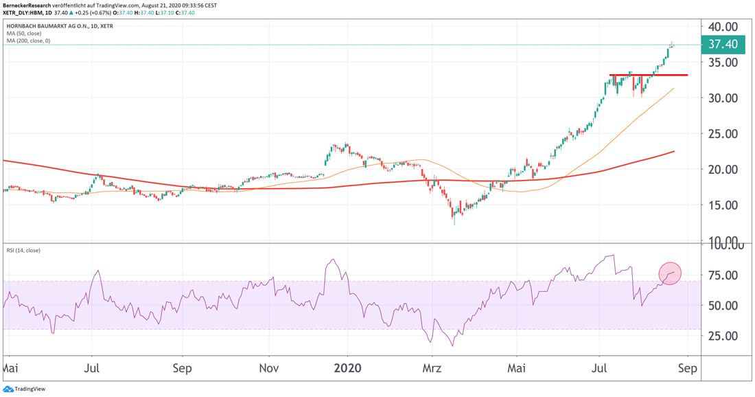 Allerdings ist unter dem Strich damit zu rechnen, dass dieser Sonderboom nicht das gesamte Jahr über gehalten werden kann. Zumindest für das zweite Quartal rechnet der Markt allerdings weiterhin mit starken Zahlen. Das hat die Aktie weiter nach oben getrieben und jetzt auch eine wichtige Belohnung zur Folge. Denn wie die Deutsche Börse AG mitteilte, rückt Hornbach Baumarkt per nächsten Montag in den SDAX auf. Dies im Zuge der Index-Veränderungen wegen der insolventen Wirecard.