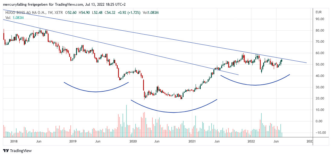 Chart 1 zeigt die Entwicklung der Aktie von Hugo Boss auf Wochencandle-Basis. Dabei wird deutlich, dass der Titel seit dem Absturz im Corona-Crash im März 2020 nicht nur einen deutlichen Aufwärtsimpuls hinter sich hat, sondern diesen seit November 2021 auch weitgehend konsolidiert hat.Deshalb spricht aus mittelfristiger Mustersicht einiges für einen baldigen Abschluss der mit umgekehrten blauen Untertassen markierten umgekehrten S-K-S-Formation.