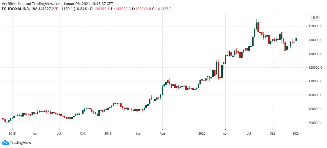 Ein Blick auf die Entwicklung des Goldpreises für eine Unze Gold in indischen Rupien zeigt, dass dieser im Jahr 2020 bis Anfang August 2020 in der Spitze bis zu 50 % gestiegen war und danach diesen Anstieg konsolidierte. Im Dezember aber machte er sich wieder auf den Weg nach oben und legte gegenüber dem Jahresanfang 2020 immer noch rund 30 % zu. Dies stellt den stärksten Anstieg des Goldpreises in Rupien seit 9 Jahren dar!