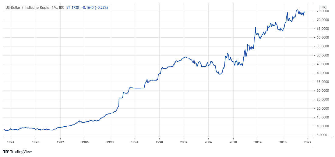 Hierbei ist nun auch die Verteilung des Wertverlustes gegenüber dem US-Dollar zu berücksichtigen. Dieser ist seit 1973 in untenstehendem Chart dargestellt und zeigt einen Wertverlust der Rupie gegen den US-Dollar um 90 %.