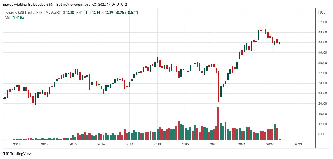 Damit bietet der indische Aktienmarkt beachtliche Anlagechancen, wie auch ein Blick auf die Kursentwicklung des iShares MSCI India ETF (IE00BZCQB185) zeigt.