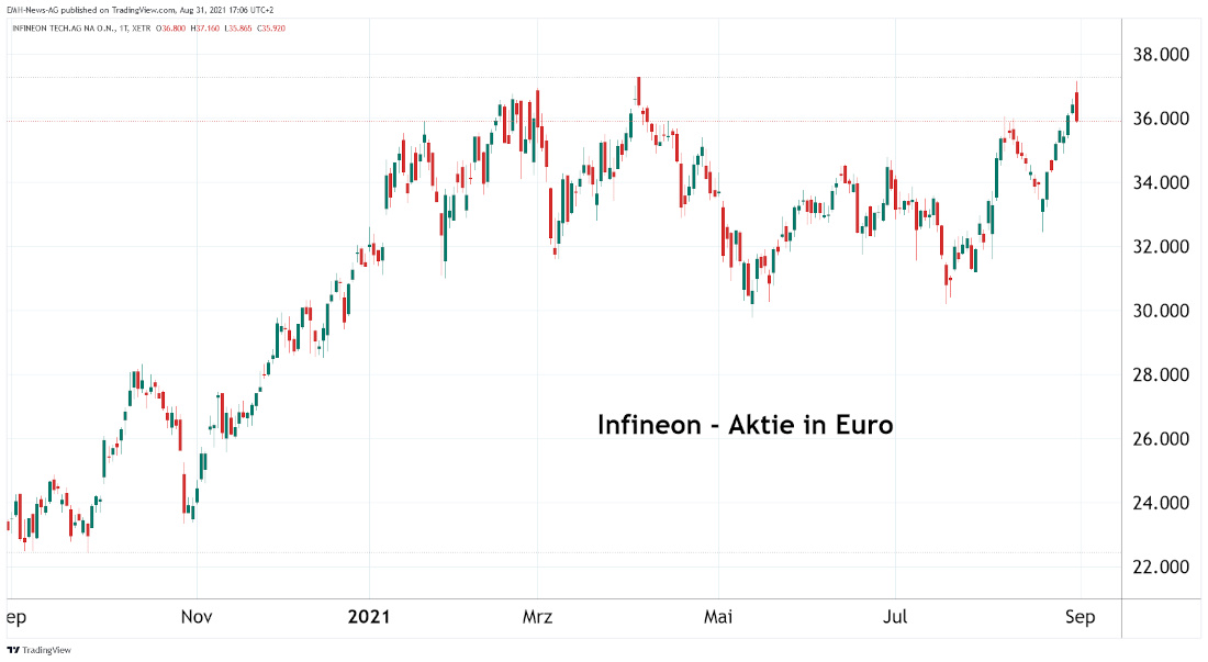 Zuletzt mussten weltweit viele Automobilproduzenten ihre Produktion aufgrund des Chipmangels drosseln. Entsprechend sind die Produkte von Infineon momentan besonders in dieser Branche begehrt, wobei unter anderem Weltkonzerne wie Bosch, Continental und Denso zu den Klienten von Infineon zählen. Auch wenn im kommenden Fiskaljahr 2021/2022 (per Ende September) zu erwarten ist, dass sich die Lage wieder normalisiert und sich somit auch die Umsatzdynamik abflacht, so bleibt Infineon aufgrund des Trends, dass immer mehr elektronische Bauteile in Fahrzeugen und insbesondere in E-Autos verbaut werden, ein aussichtsreiches Wachstumsunternehmen.