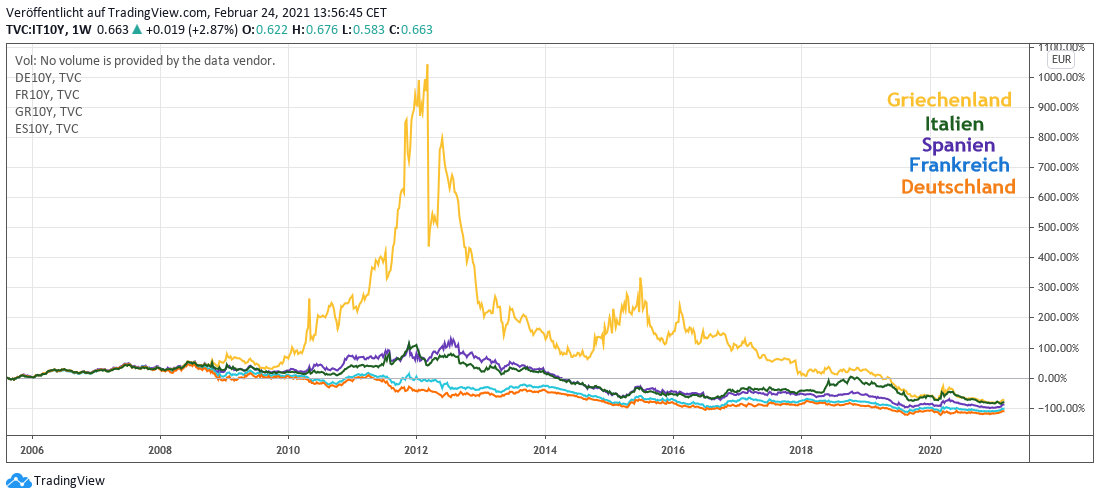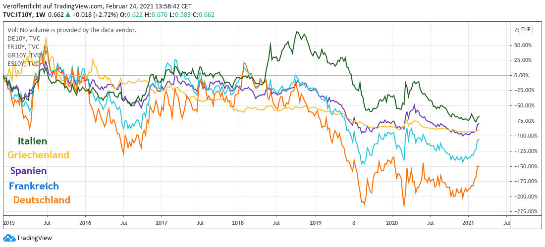 Nun hat sich als Folge auch die Inflationsrate in der Eurozone nach neuesten Zahlen von Eurostat deutlich erhöht. So lag die Inflationsrate in der Eurozone insgesamt im Januar 2021 bei 0,9 %, nachdem sie im Dezember 2020 noch – 0,3 % betragen hatte. Im Januar 2020, kurz vor dem Corona-Schock, lag sie hingegen bei 1,4 %.