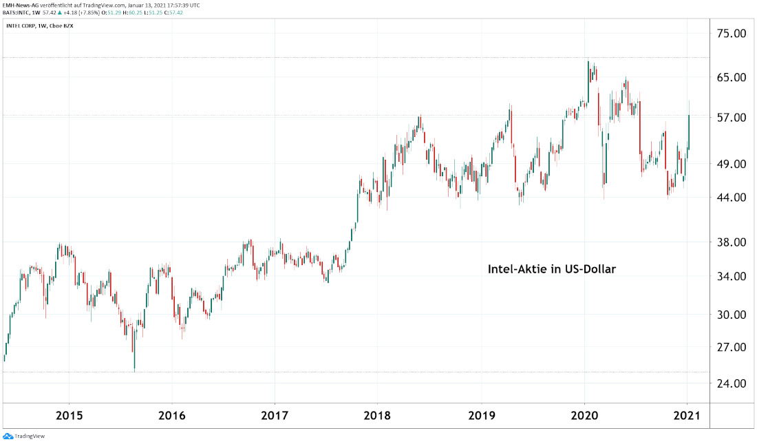 In den vergangenen zwölf Monaten geriet der Chipproduzent Intel (ISIN: US4581401001; WKN: 855681) gegenüber Konkurrenten wie AMD (ISIN: US0079031078; WKN: 863186) und Nvidia (ISIN: US67066G1040; WKN: 918422) immer stärker unter Druck. Während beide Titel dank neuer Produkte, die gut vom Markt angenommen werden, im Jahresvergleich um rund 74 % bzw. 95 % zulegen konnte, trat die Intel-Aktie unter hohen Schwankungen zeitgleich nahezu auf der Stelle. So litt Intel insbesondere unter einem Strategiewechsel des Apple-Konzerns, der seine Mac-Computer künftig mit eigenen Prozessoren ausstatten will.