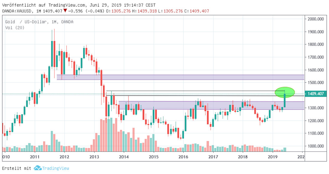 Gold schloss per Monatsschluss bei 1409,41 US-Dollar und damit so hoch wie seit April 2013 nicht mehr. Damals kam es, wie im unten stehenden Preischart zu sehen, zu einem massiven Abverkauf nach einer Doppeltopbildung. Derzeit ist das Gold dabei, die seither gebildete Bodenformation zu beenden. Mit Überschreiten des Monatsschlusskurses vom August 2013 bei 1395.20 US-Dollar hat sich Gold für einen Sprung in die Zielzone zwischen 1530 und 1555 US-Dollar gut positioniert, was einen kurzfristigen Rückgang bis in den Bereich von 1285 US-Dollar nicht ausschließt. Damit würde der Goldpreis auch eine symmetrische Entsprechung der Gegenbewegung zwischen April und August 2013 bilden.