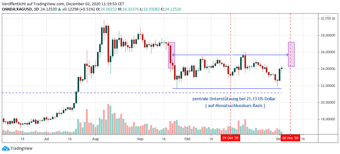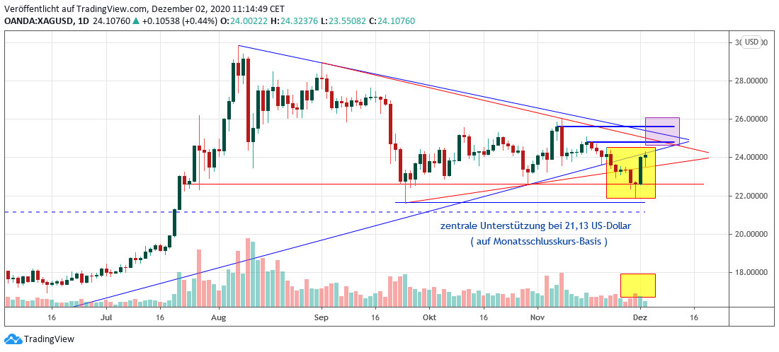 Silber hat nach dem Ausbruch aus beiden Keilen nun aber qualitativ 2 Merkmale: Erstens schloss es auf Tagesschlusskursbasis auf dem Niveau der Unterstützung vom 23.07.2020. Und zweitens lag der Intraday-Kurs der kleineren Korrektur mit 21,90 Dollar am 30.11.2020 höher als das erste Zwischentief am 24.09.2020, welches bei 21,66 Dollar lag.