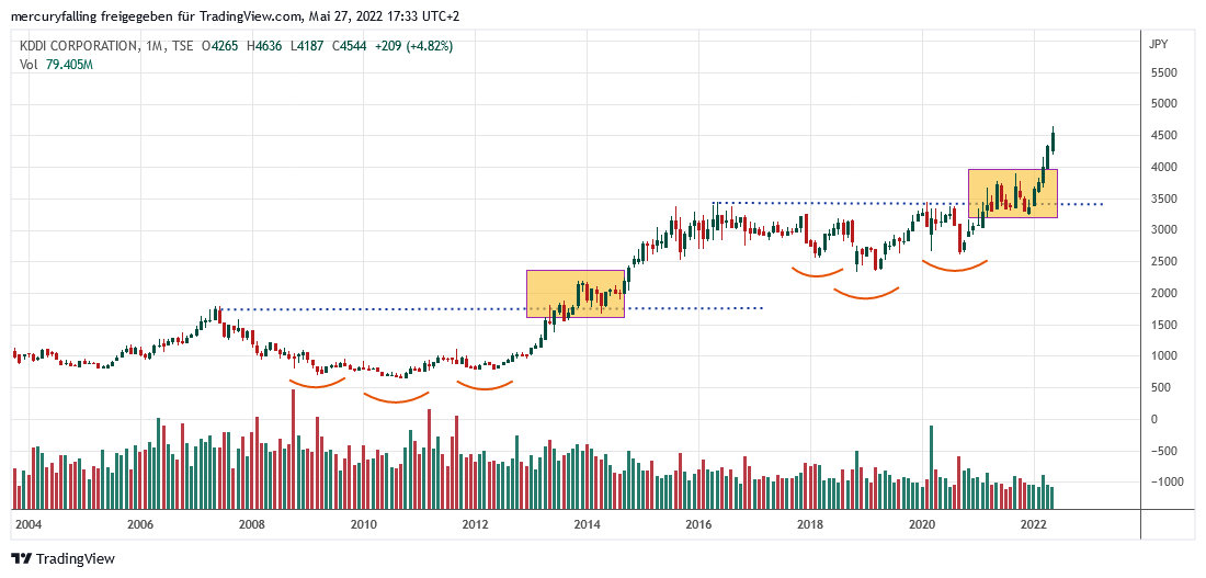 Diese Konsolidierungszone hat die KDDI-Aktie auch auf Monatscandle-Basis Ende März 2022 verlassen und zur nächsten mittelfristigen Aufwärtsbewegung abgesetzt.