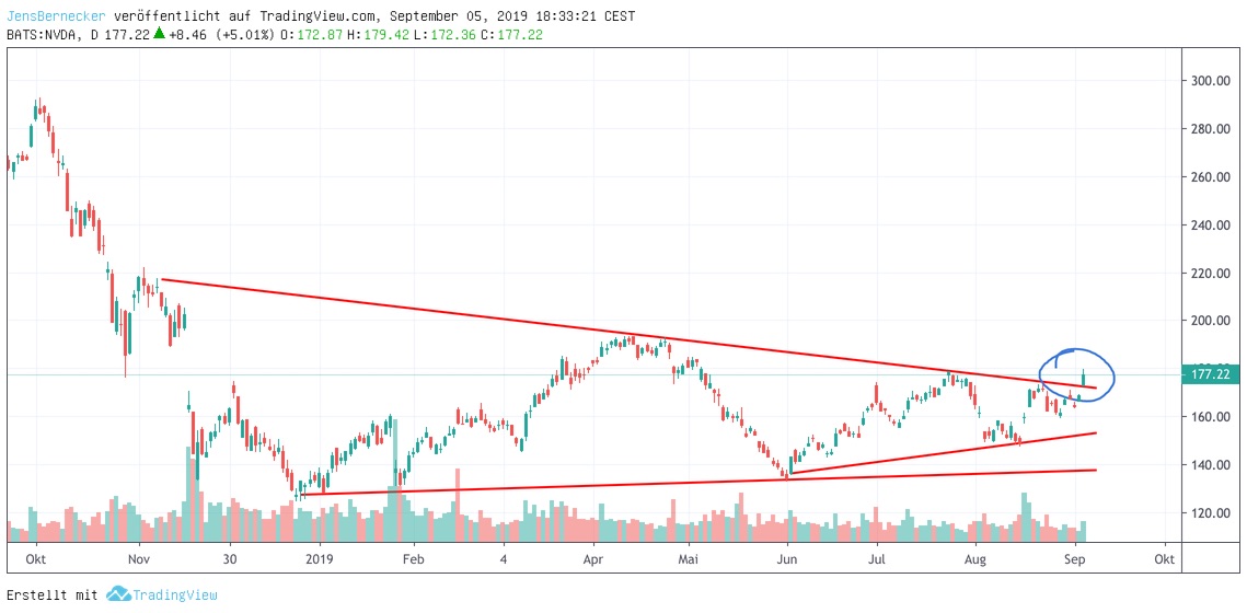 Am 06.08 hatten wir bei 151 Dollar zuletzt zum Einstieg geraten. Gerade noch rechtzeitig, denn nun erfolgte, wie bei zahlreichen anderen US-Werten auch, das finale Kaufsignal nach der langen Bodenbildung seit der Korrektur im Herbst 2018. Kurs aktuell 171 Dollar, also immerhin schon 13% innerhalb von drei Wochen.