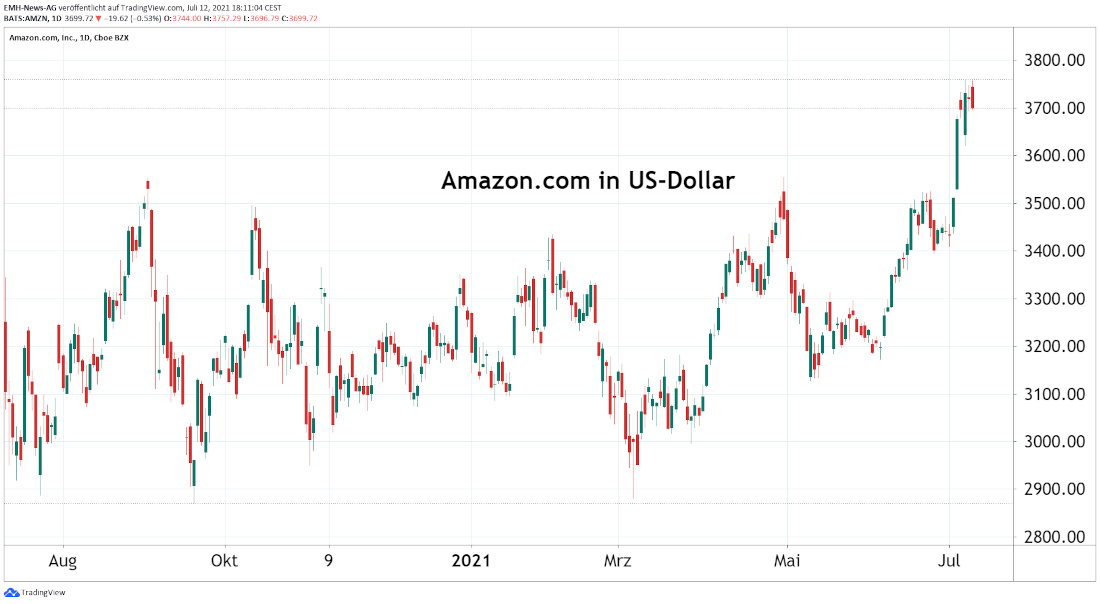 Nachdem die Amazon.com-Aktie (US0231351067) zwischen Mitte März 2020 und Anfang September 2020 eine rasante Aufwärtsentwicklung vollzogen hatte und in der Spitze von 1.626 US-Dollar auf 3.552 US-Dollar gestiegen war, wechselte der Titel in eine Konsolidierungsphase über, wobei das Papier mit einem Zwischenhoch bei 3.554 US-Dollar im April eine Doppeltop herauszubilden schien. Allerdings konnte der Anteilschein jetzt diese Widerstandszone nachhaltig überwinden, weshalb aus technischer Sicht jetzt tatsächlich ein eindeutiges Kaufsignal generiert werden konnte.