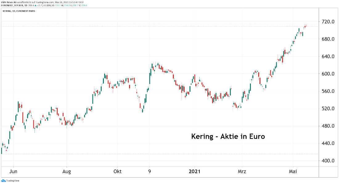 Aber auch in den übrigen Regionen ist Kering mit seinen Luxusmarken wie Gucci und Yves Saint Laurent gut für die Zeit nach Corona aufgestellt. Demnach konnte der Konzern in Nordamerika gegenüber dem Vorjahreszeitraum um immerhin 46 % zulegen, nachdem sich das Umsatzplus im Weihnachtsquartal lediglich auf 11 % belief. Zudem erwarten wir, dass Kering ab dem zweiten Quartal auch wieder ein deutliches Erlösplus in Europa verbuchen kann, da die Vorjahresbasis hier in diesem Zeitraum besonders schwach war und die Impfkampagnen mittlerweile auch zwischen der iberischen Halbinsel und Skandinavien immer bessere Erfolge zeigen. Aussichtsreich ist bei Kering auch der Vertrieb über die E-Commerce-Schiene, wobei die Internetverkäufe bei Kering gegenüber dem Vorjahreszeitraum um 108 % in die Höhe schossen.