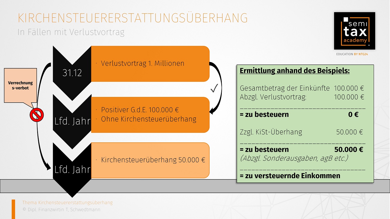 Die Kirchensteuer wird steuerrechtlich als Sonderausgabe bei der Ermittlung des zu versteuernden Einkommens berücksichtigt. Erstattete Kirchensteuerbeträge können nur im Jahr der Rückzahlung mit Kirchensteuerzahlungen verrechnet werden. Liegen zum Beispiel geringere Zahlungen in einem Jahr vor als erstatte Kirchensteuerbeiträge (z.B. bei Austritt oder aufgrund einer Betriebsprüfung) entsteht ein Kirchensteuererstattungsüberhang.