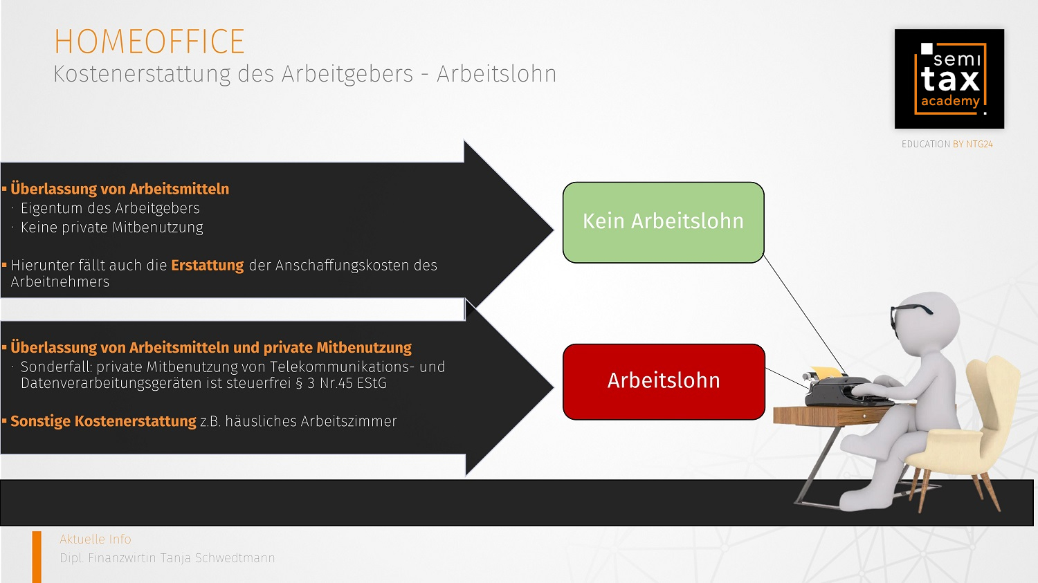 Kostenerstattung für weitere Aufwendungen, die durch die Arbeit von zuhause anfallen, stellen regelmäßig Arbeitslohn dar z.B. Erstattungen/Beteiligung an den Kosten für das häusliche Arbeitszimmer.
