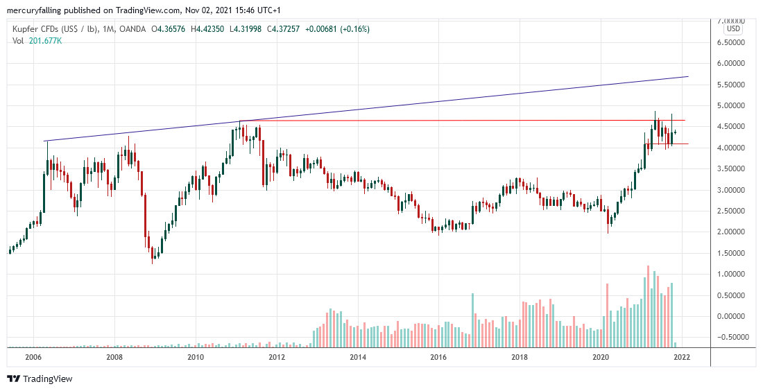Der Kupferpreis hat nach Erklimmen eines neuen Allzeithochs im Mai bei 4,4235 US-Dollar die vorangegangenen Gewinne konsolidiert, hatte ab Mitte Oktober aber wieder deutlich zugelegt. Der in Chart 1 sichtbare Ausbruch nach oben ist damit aber noch nicht signifikant, da er auf Monatscandle-Basis diesen noch nicht bestätigt hat.