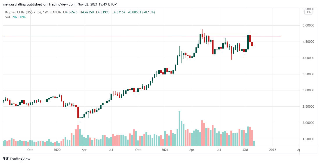 Auf Wochencandle-Basis hat Kupfer zudem mit dem Aufwärtsimpuls Mitte Oktober 2021 ein zweites Hoch gebildet, das zu einem potenziellen Doppeltop und damit zu einer mittelfristigen Richtungsumkehr führen könnte.
