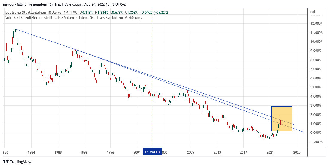 Auf Monatscandle-Basis dürfte, wie ein Blick auf Chart 1 zeigt, der seit 1990 laufenden Abwärtstrend per Ende August 2022 und damit in der kommenden Woche bestätigt werden. Damit steht eine wichtige charttechnische Ampel für stark steigende deutsche Anleiherenditen auf Grün. Die Bestätigung für den längerfristigen Trend steht dabei zwar noch aus. Wie aber ein Blick auf Chart 2 zeigt, ist die Rendite der 10-jährigen deutschen Bundesanleihe in dieser Woche praktisch bis an die längerfristige Trendlinie gestiegen. Bereits ein kleiner weiterer Anstieg für bis Ende November 2022 auch hier die erwartete charttechnische Signifikanz generieren.
