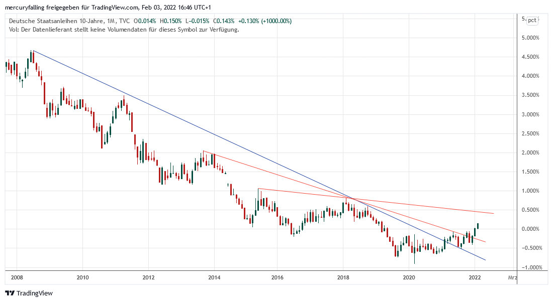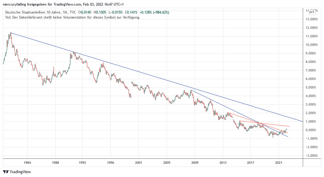 Aus charttechnischer Perspektive handelt es sich also bei der jüngsten Aufwärtsbewegung um das Schwungholen zum Bruch des seit rund 40 Jahren andauernden Zinsabwärtstrends!
