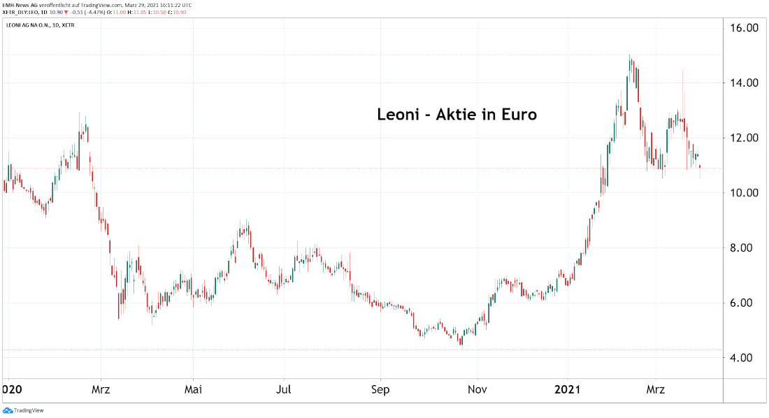 Zwar zeigte sich Leoni zuletzt für die zweite Jahreshälfte 2021 wieder zuversichtlicher. Allerdings kann zu Recht befürchtet werden, dass diese Einschätzung zum Großteil auf Zweckoptimismus basiert, um die Investoren nicht noch stärker zu verschrecken. Entsprechend zeigten sich auch viele Analystenhäuser wie JPMorgan und Kepler Cheuvreux für die weitere Entwicklung der Aktie skeptisch, wobei letztere Firma zuletzt ein Kursziel von 6 Euro sah. Skeptischer zeigte sich auch zuletzt wieder der Kapitalmarkt, wobei die Aktie seit Mitte Februar wieder einen kurzfristig massiven Abwärtstrend herausgebildet hat.