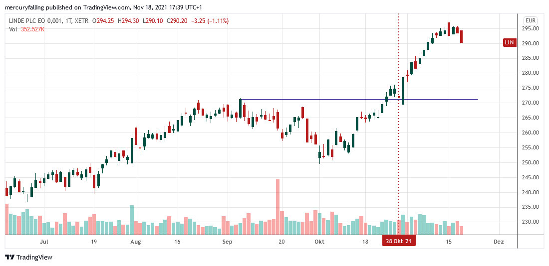 Der Kurs der Linde-Aktie reagierte am Tag der Quartalszahlen am 28.10.2021 nicht zuletzt durch Gewinnmitnahmen leicht schwächer und testete dabei seine Unterstützung bei rund 271,50 Euro. Aber bereits Stunden später drehte die Aktie wieder nach oben, bestätigte den Ausbruch und setzte ihren Marsch nach Norden fort.
